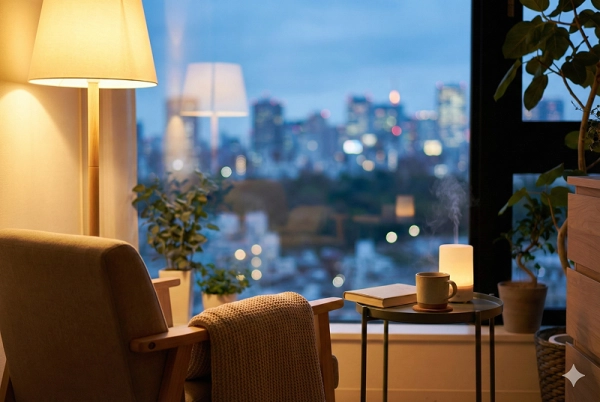 - 一日の終わりは、都会の煌めきを眺めながら。温かいハーブティーとアロマの香りで、張り詰めた心をゆっくりと解き放ちます。